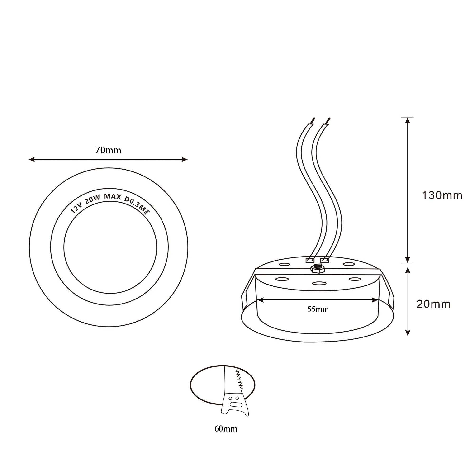 Foro 58-60mm | diametro esterno 70mm | profondità di installazione | 23mm