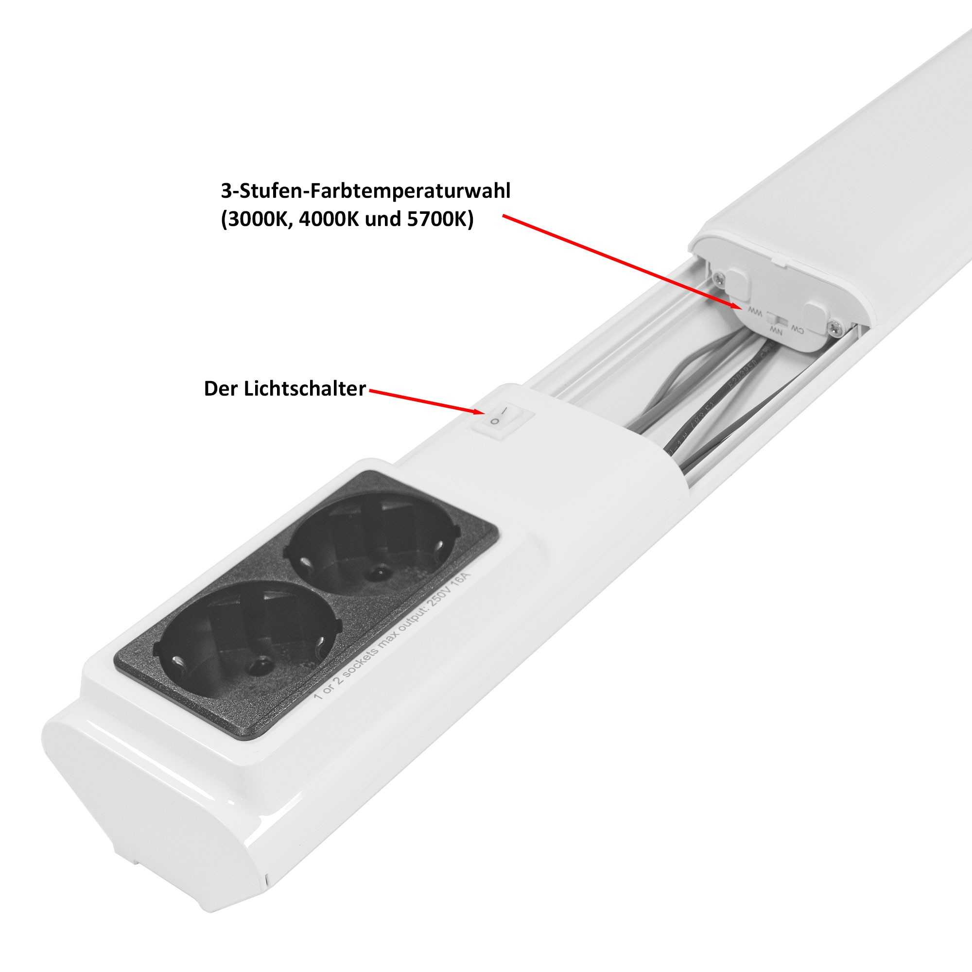 De 80cm LED onderkastlamp biedt 12W vermogen, 1500 lumen en drie selecteerbare kleurtemperaturen (3000K, 4000K, 5700K). Hij is ideaal voor de keuken en maakt indruk met zijn slanke ontwerp, eenvoudige installatie, geïntegreerde schakelaar en twee extra stopcontacten. Flikkervrije werking voor aangenaam licht.
